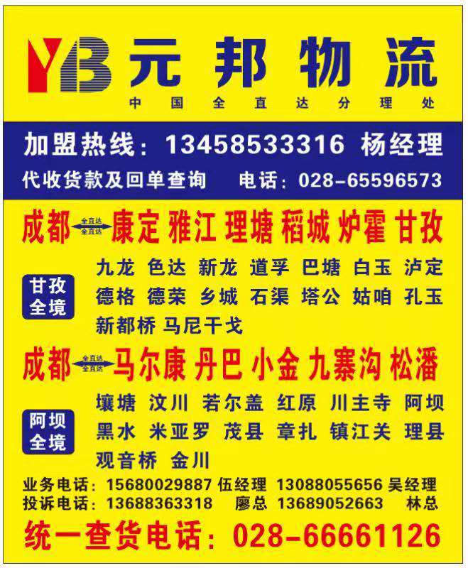 成都到稻城物流專線【元邦物流,簡單快捷,專線直達,天天發(fā)車 】成都:028- 83902577 手機:13688363318聯(lián)系人:廖經(jīng)理茂縣、汶川、理縣、馬爾康、黑水、松潘、九寨溝、金川、紅原、若爾蓋、壤塘、阿壩縣、色達、石渠、甘孜縣、德格、白玉、新龍、道孚、丹巴、雅安、康定、雅江、理塘、巴塘、得榮、鄉(xiāng)城、稻城、九龍、木里、攀枝花、寧南、西昌、雷波、越西、馬邊、漢源四川元邦流有限公司“一直被模仿,從未被超越,創(chuàng)造品牌,以誠信取勝。”時間證明一切,每天進步一點點。